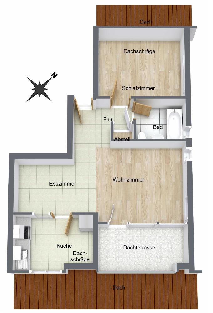 Die ca. 51 m² große Wohnung überzeugt durch einen ruhigen und hellen Charakter sowie einen offenen, modernen Grundriss. Über den Flur mit Garderobenmöglichkeit gelangt man in den offen gestalteten Wohn- und Essbereich. Das Wohnzimmer bietet direkten Zugang zur windgeschützten Dachterrasse mit ca. 8 m² Fläche und Süd-Ostausrichtung. Die Küche ist ca. 6,5 m² groß und mit einer Einbauküche ausgestattet, bestehend aus Ober- und Unterschränken, Spüle, Kühlschrank, Herd mit Ceranfeld, Umlufthaube und Spülmaschine.