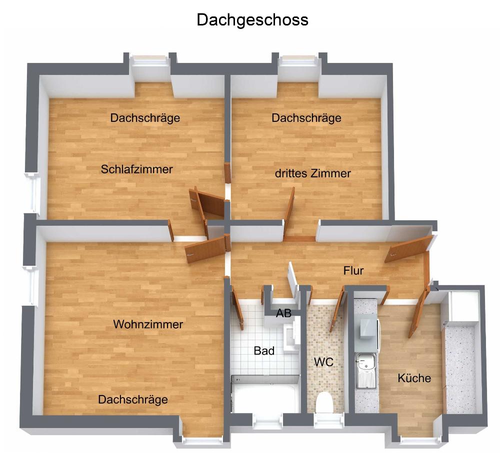 – insgesamt 3 Zimmer (Wohnzimmer, Schlafzimmer und drittes Zimmer) im Dachgeschoss des Hauses, ca. 60 m²
